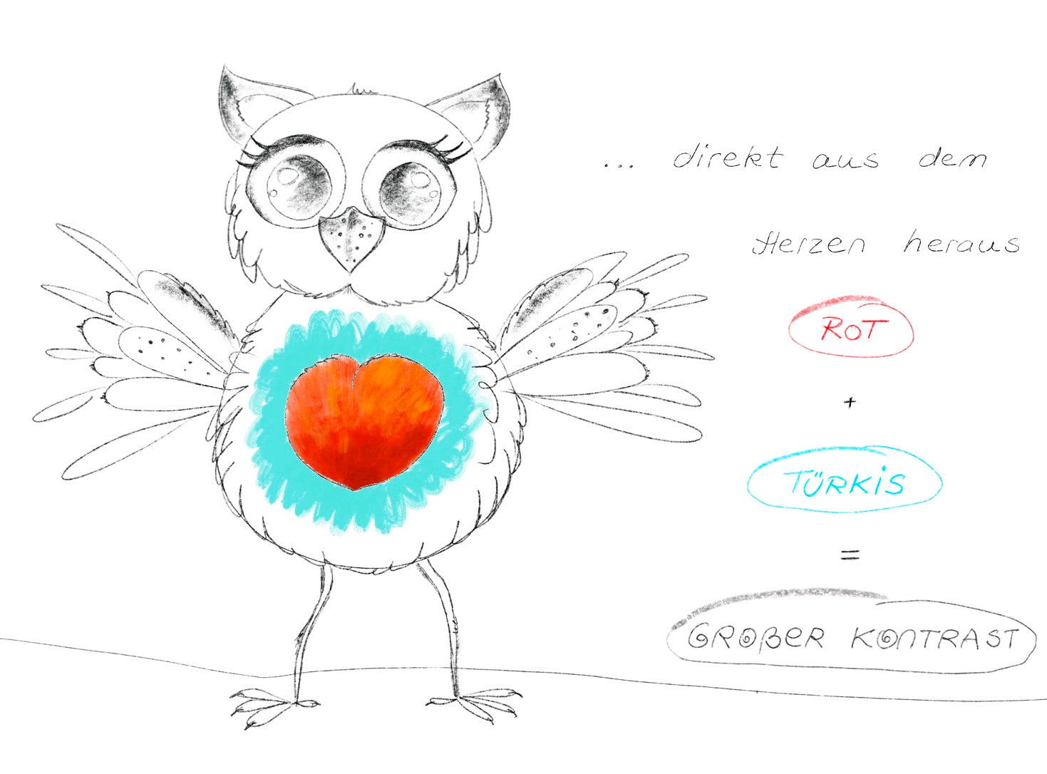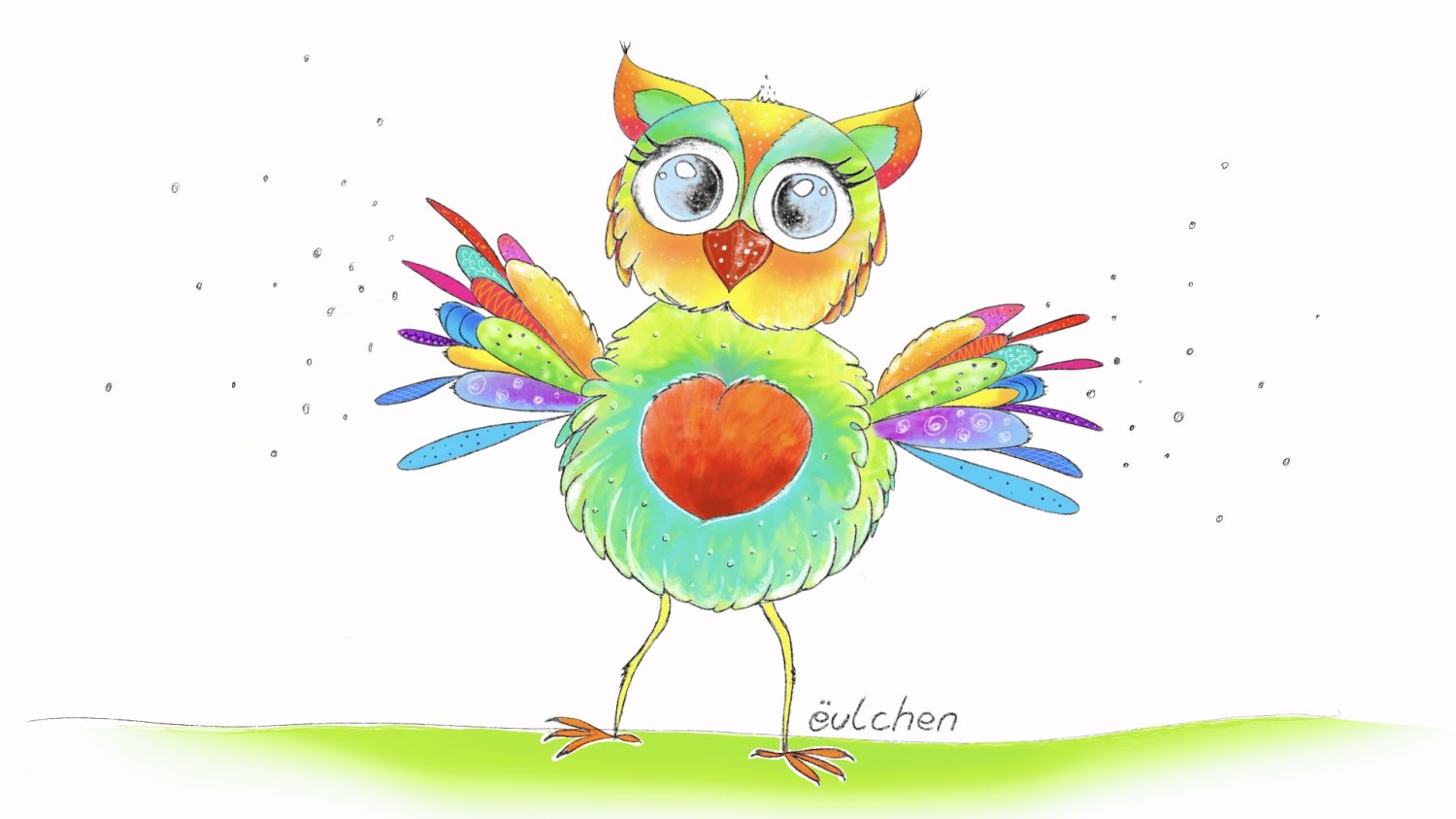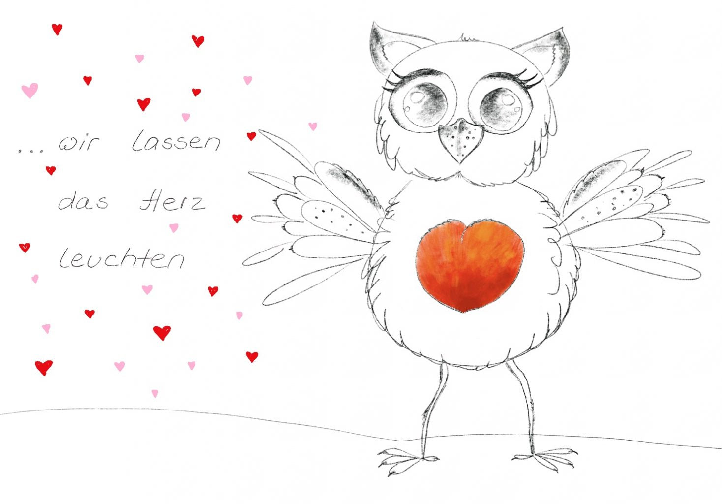 Beginne beim Ausmalen in der Mitte. Ein kräftig rotes Herz macht dein EULCHEN zu einem ganz liebevollen Wesen.